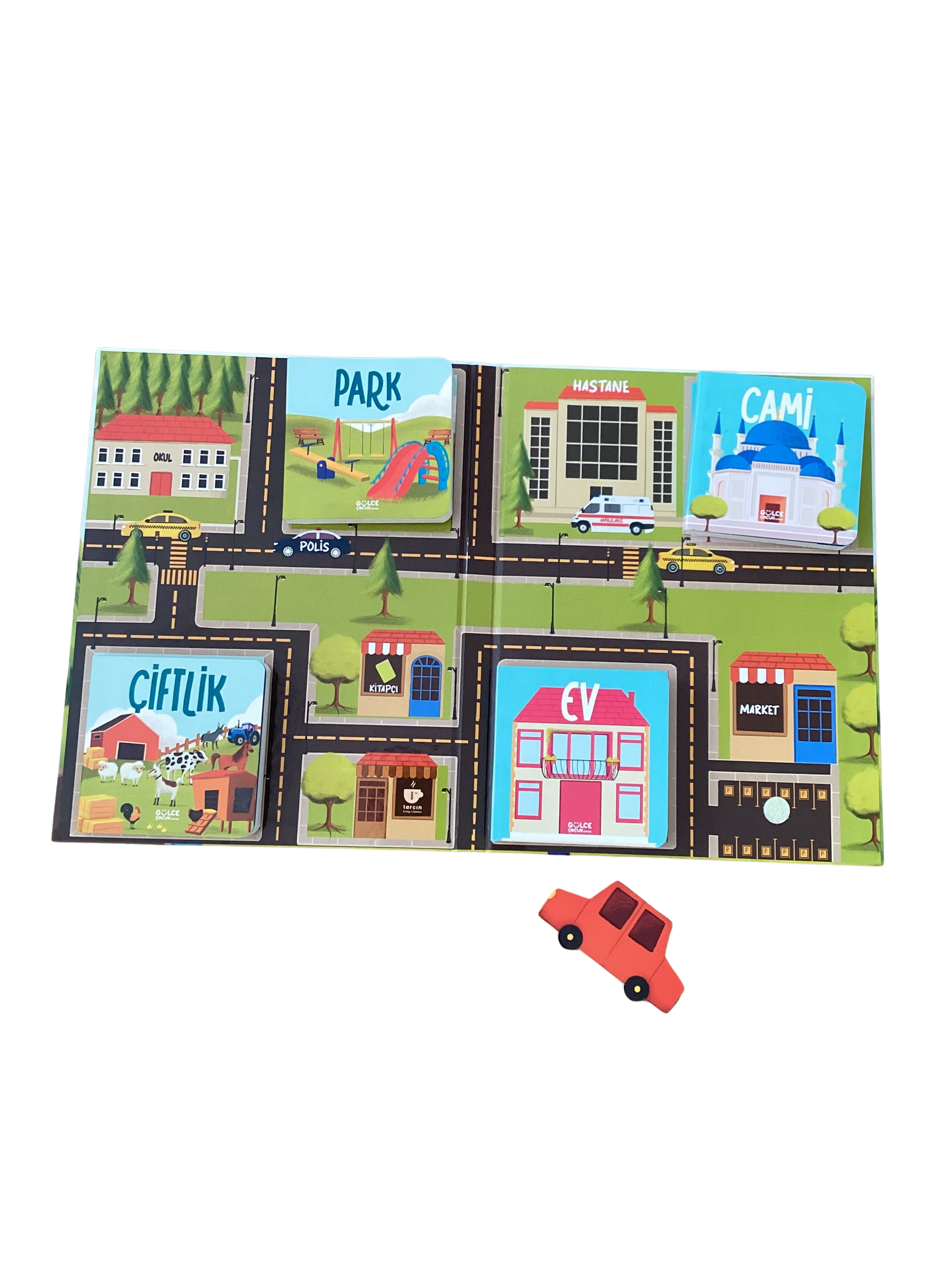 Bu özel karton kitap seti, kitapları bir oyuncağa dönüştürerek öğrenmeyi eğlenceli hâle getiriyor. Kitabı açtığında içinde sabitlenmiş dört ayrı mini kitap ve bir mahalle krokisi seni karşılıyor. Oyuncak arabayla mahallede gezebilir, duraklarda bulunan kitapları alarak ilk kelimelerini keşfedebilirsin.