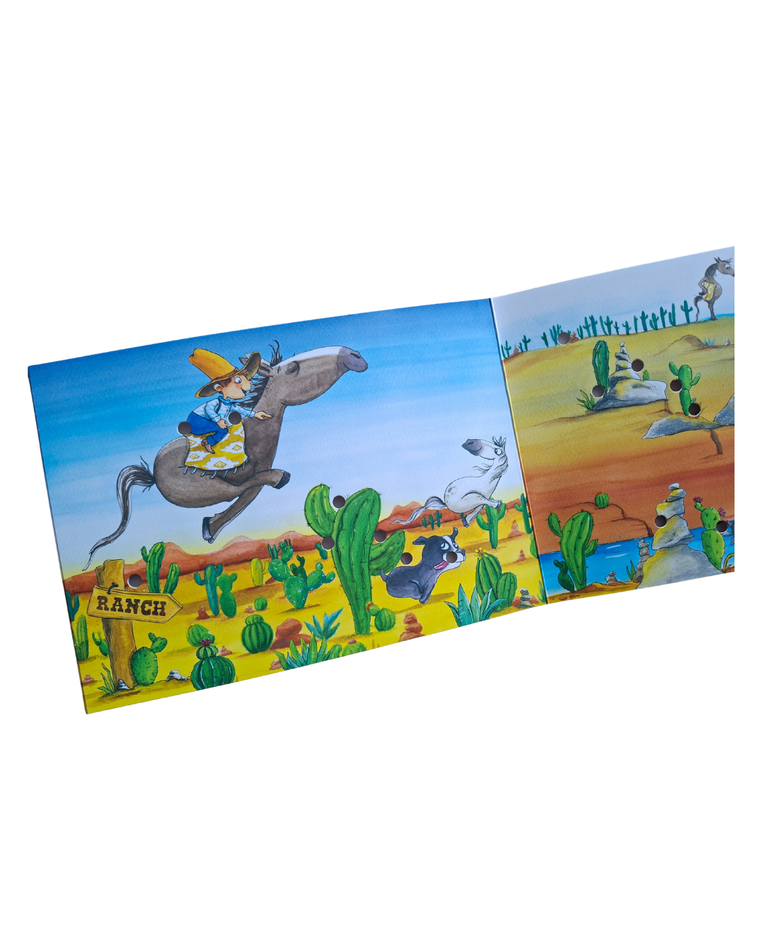 Begleite Cowboy Jack und seine tierischen Freunde auf einer rasanten Verfolgungsjagd durch die Prärie! Das Pferd Pepe macht, was es will, und nur geschickte Kinderhände können helfen, es einzufangen. Kinder spinnen selbst den roten Faden, verfolgen Pepe durch leere Fässer und vorbei an Kakteen – und können ihre Lösung auf der Rückseite überprüfen.